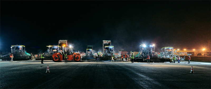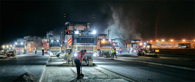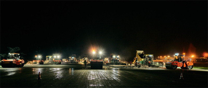 在不足 5 小時的施工窗口期內(nèi),8 臺維特根銑刨機次第排開,將舊瀝青道面銑刨移除;6 臺福格勒攤鋪機覆蓋跑道全幅寬度,多臺壓路機緊隨其后往復碾壓。