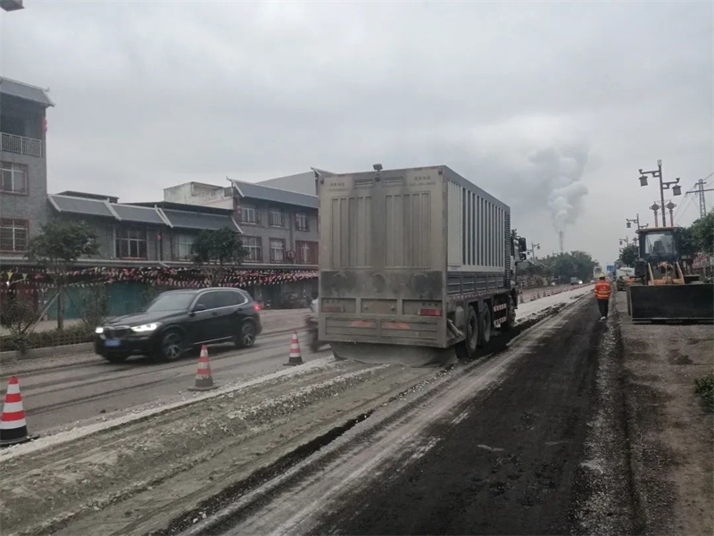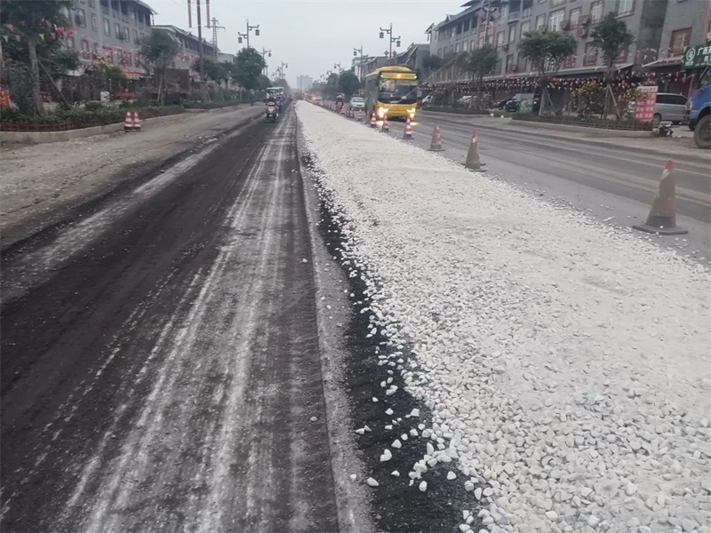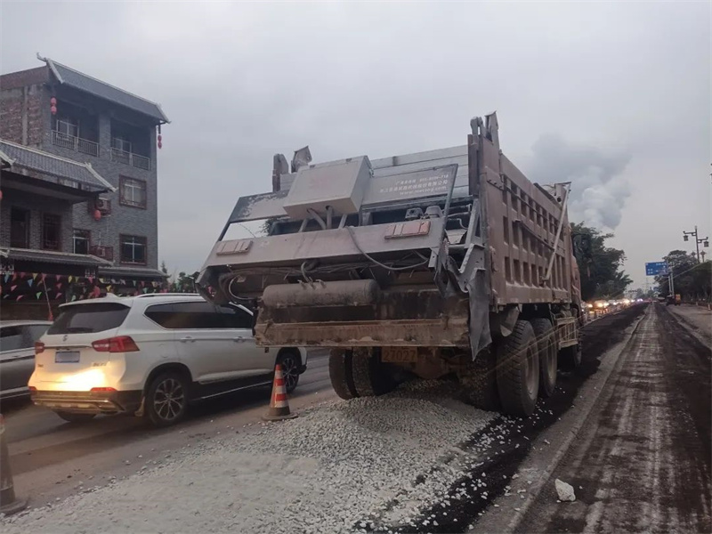 2.然后使用集料撒布機將新加的碎石和石屑(已按 1:1 比例預(yù)先混配好)均勻撒布于銑刨料之上;